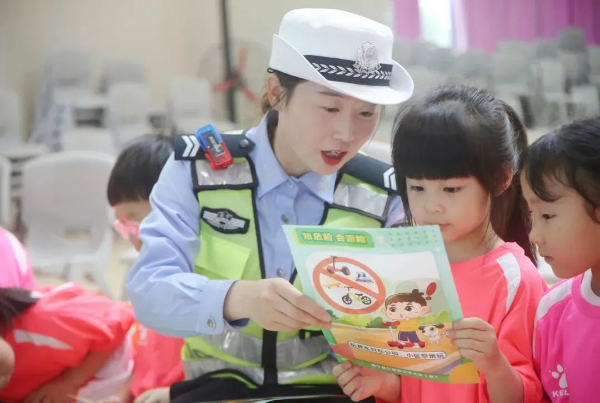 在周宁县警宝托管班,女骑警队员通过情景互动开展交通安全教育。课堂上,一双双高举的小手争先恐后地回答提问:“我知道!头盔就像安全卫士,会保护我们的小脑袋。”通过“一问一答”等趣味形式,交通安全知识化作一颗颗种子,悄然播撒进孩子们的心田。