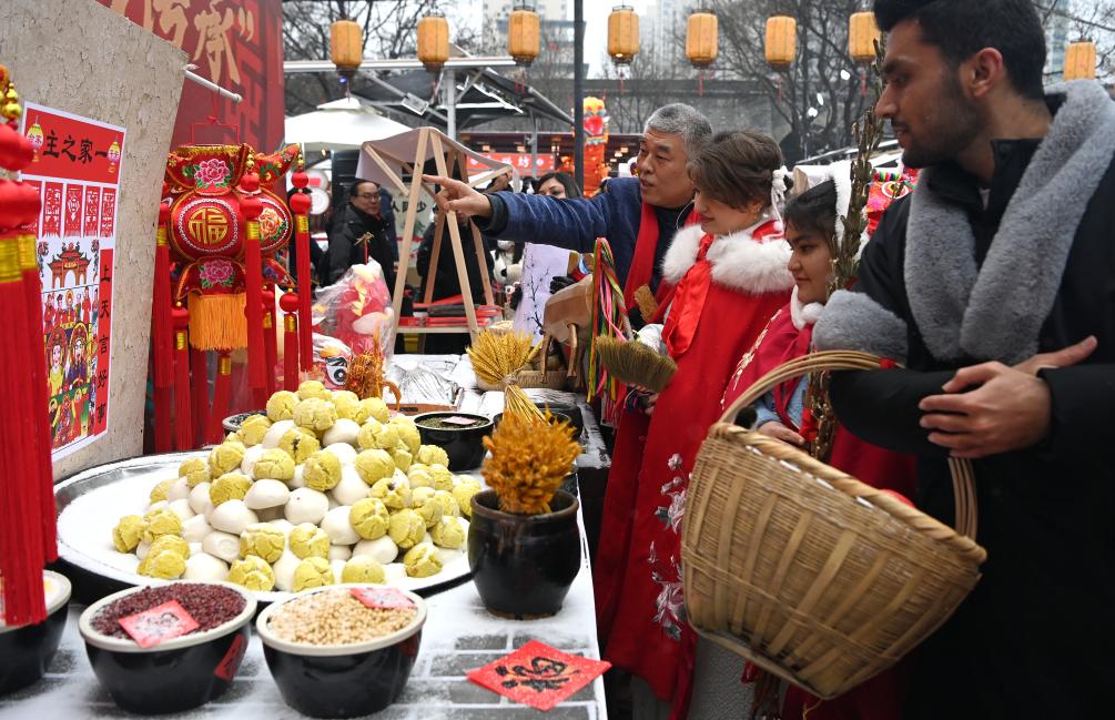 2月2日,在西安永兴坊举行的小年活动上,来自西安各大学的留学生在民俗专家的讲解下了解小年祭灶所用的物品。新华社记者 刘潇 摄