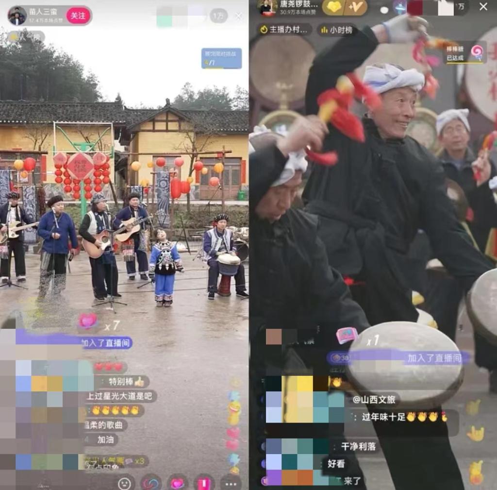 湖南省凤凰县腊尔山镇苗寨中,4个“90后”苗族小伙组成乐队自办“村晚”,规模不大,唱火家乡;山西临汾的村民们用簸箕、黄豆当乐器,配合唢呐和非遗晋南威风锣鼓,直播连线上千公里外的苗乡,南北大联欢释放独特的精彩,吸引在线观众近800万人……