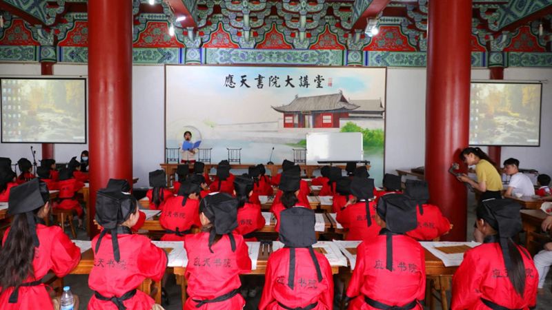 目前,商丘师范学院成立“应天书院研究中心”,开设“应天国学堂”,并设归德书院承续文脉。作为重要的文化研学基地,创新开发“六艺”课程,涵盖拜师礼、拓印、射礼等传统礼仪活动,累计接待学子超万人次。