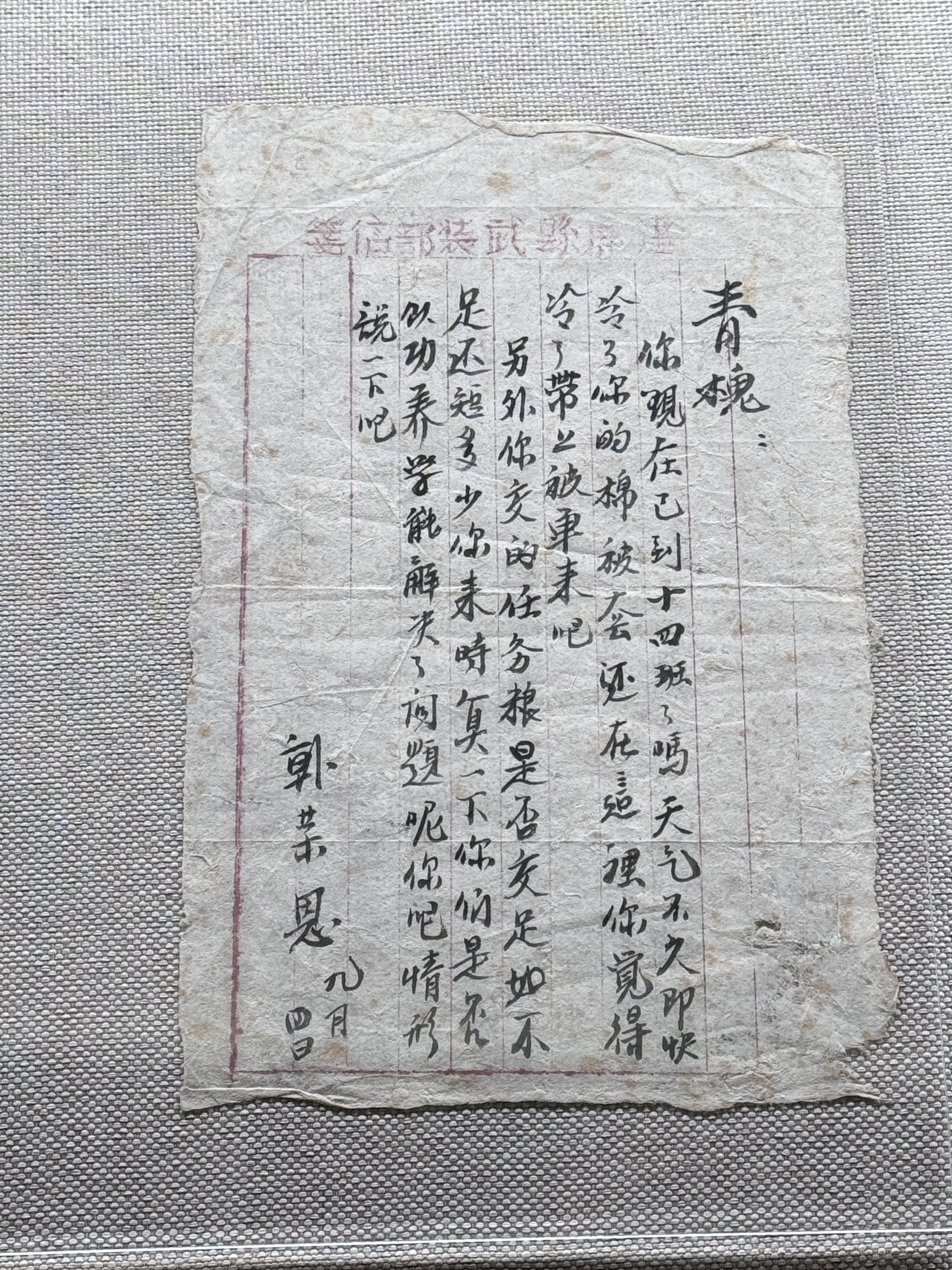 铭记历史、缅怀先烈,珍爱和平、开创未来。中国精神文明网推出“云鉴馆藏·红色家书”专题策划,讲述革命先辈的家规家训,在聆听红色家书故事中汲取奋进力量,传承革命前辈红色家风。今天为您介绍石家庄解放纪念馆的馆藏文物——韩荣恩写给儿子的最后一封家书。